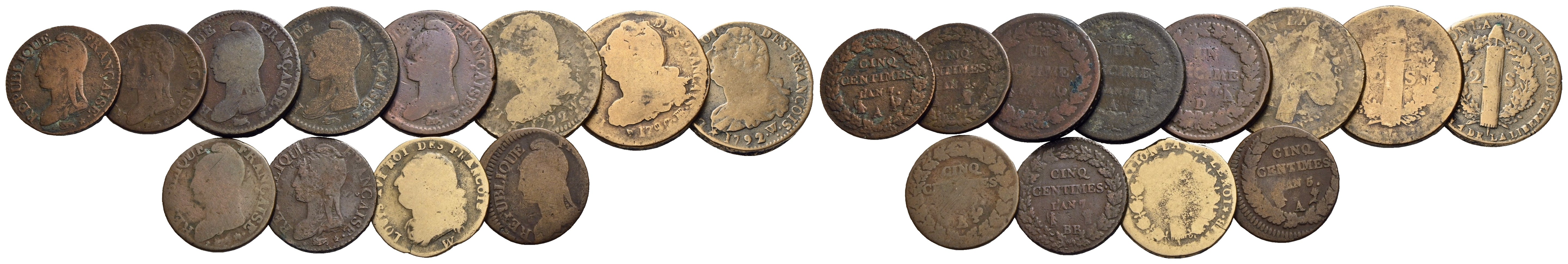 2 Sols 1792 W, Lille (2) und BB, Straßburg. 12 Deniers W, Lille. Decime AN 7 (1798/99) A, Paris (2) und D, Lyon. 5 Centimes AN 5 (1796/97) A, Paris; AN 7 A, Paris und BB Straßburg; AN 8 (1799/1800) BB; Jahreszahl unkenntlich A.