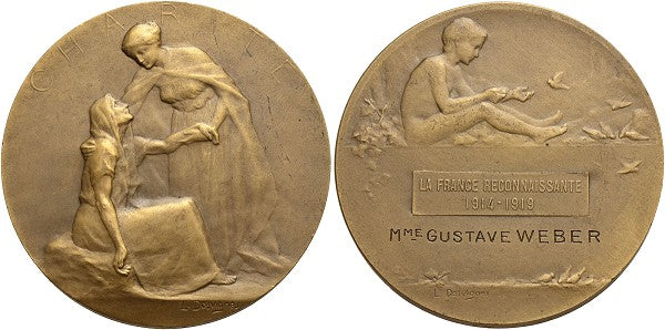 Rv.: Nackter sitzender Knabe füttert Vögel, darunter Tafel mit Prägung LA FRANCE RECONNAISSANTE / 1914-1919, darunter graviert MME GUSTAVE WEBER, signiert im Abschnitt L. Desvignes.