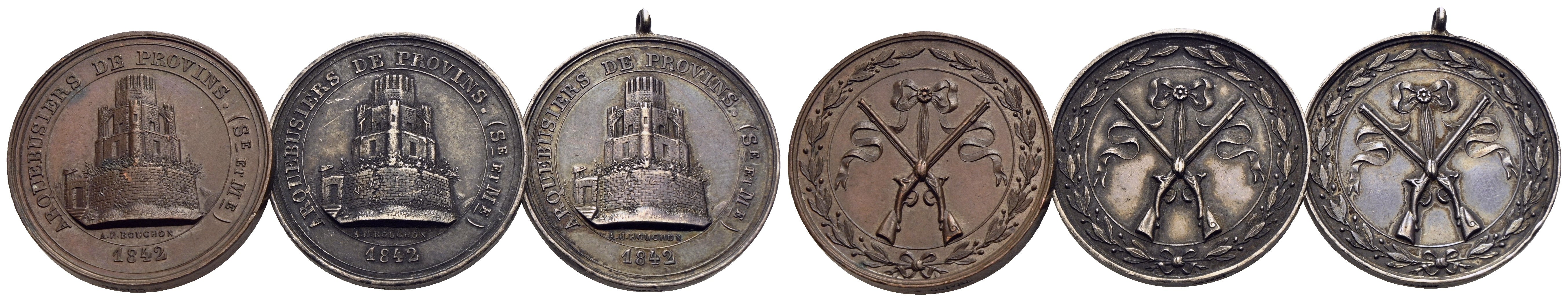Dm.: 30 mm. AR-Medaille mit Randpunze ARGENT. Gew.: 10,99 g. AE-Medaille mit Randpunze CUIVRE. Gew.: 14,00 g. Beide mit Henkelspur. Sowie AR-Medaille mit Randpunze ARGENT und angesetzter Queröse. Gew.: 11,15 g.