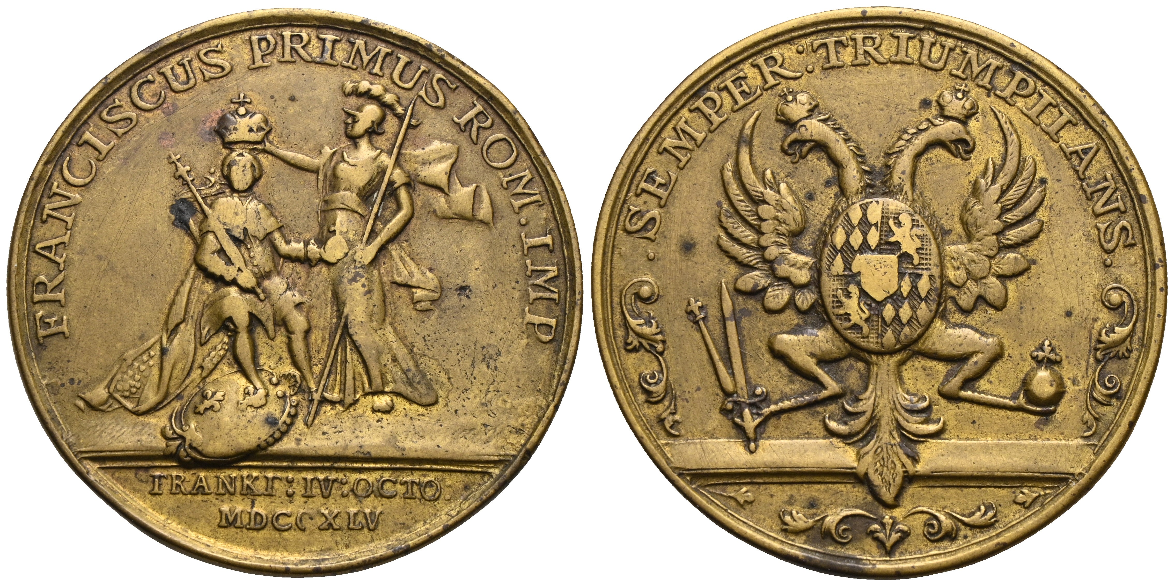 Av.: FRANCISCUS PRIMUS ROM IMP, thronender Franz Stephan mit Reichsinsignien und Fuß auf dem französischen Wappenschild wird von stehender Roma gekrönt, im Abschnitt FRANKF IV OCTO / MDCCXLV.