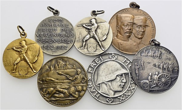 Vergoldete AR-Medaille, AR-Medaille und Weißmetall-Medaille auf die 400jährige Zugehörigkeit Riehens zu Basel 1922. Aeppli: 298; Hofer: 314.