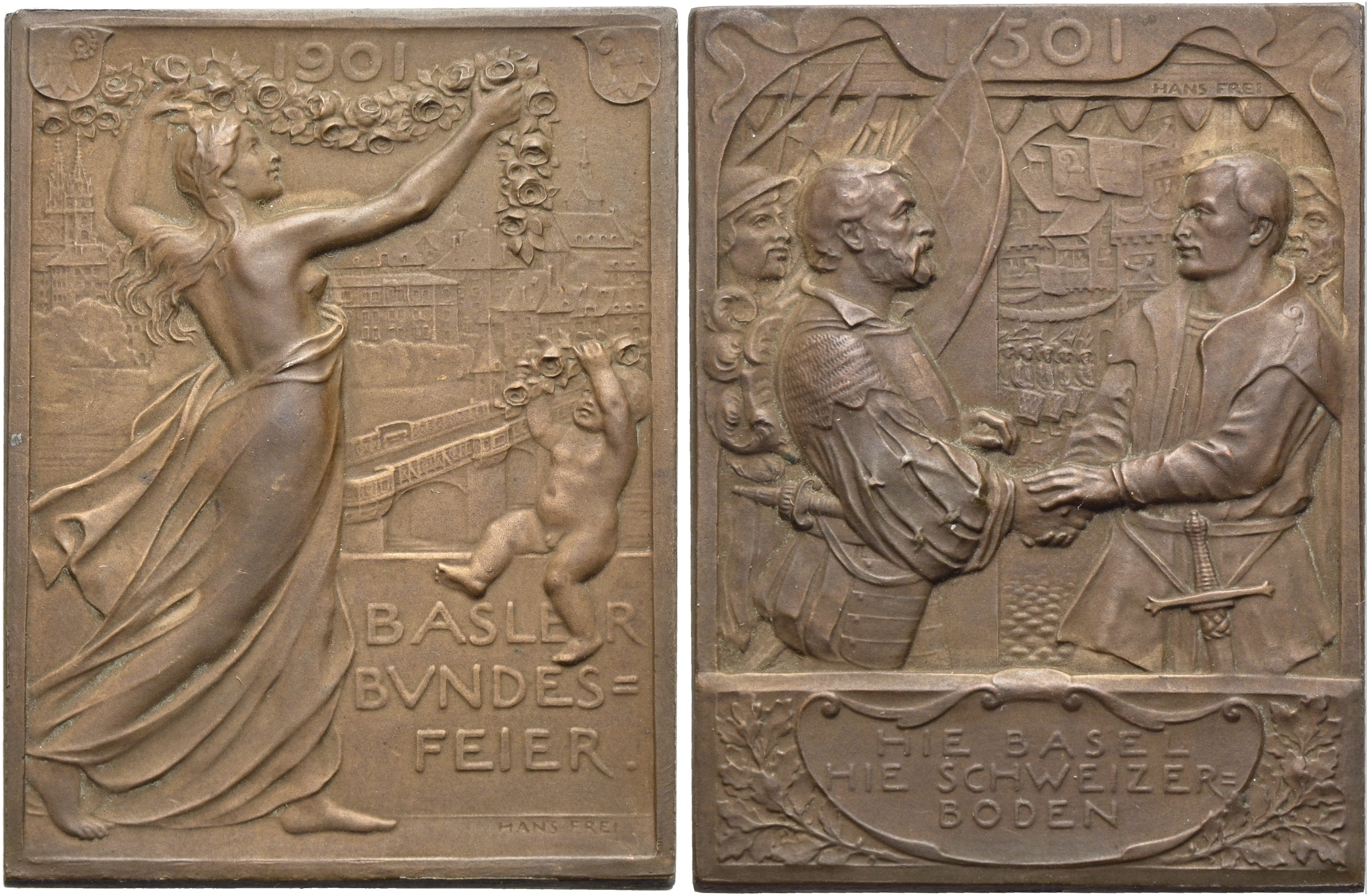 Rv.: Hüftbilder von sich die Hände reichenden Eidgenossen und Basler, im Hintergrund Festzug, oben ein Spruchband mit 1501, in einer Kartusche zwischen Eichenzweigen 3-Zeilen-Schrift: HIE BASEL / HIE SCHWEIZER= / BODEN, signiert oben HANS FREI.