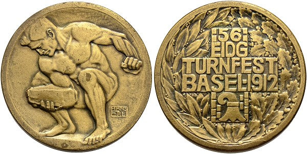 Rv.: 56 / EIDG / TURNFEST / BASEL 1912, eidgenössisches Kreuz mit Baselstab vor Lorbeer- und Eichenlaub.