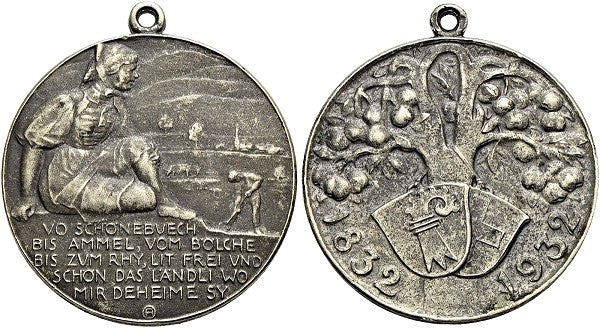 Av.: In Landschaft sitzende Baselbieterin, darunter der Anfang des Baselbieterliedes, VO SCHÖNEBVECH / BIS AMMEL; VOM BÖLCHE / BIS ZVM RHY; LIT FREI VND / SCHÖN DAS LÄNDLI WO / MIR DEHEIME SY, signiert unten Monogramm HF.