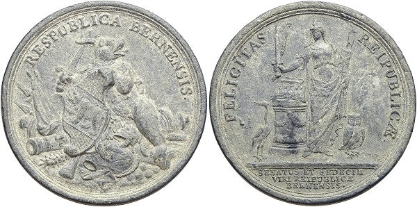 Rv.: FELICITAS REIPUBLICAE, Religio steht an Altar zwischen Eule und Kranich, im Abschnitt SENATUS ET SEDECIM / VIRI REIPUBLICAE / BERNENSIS, signiert rechts I. DASSIER / F.