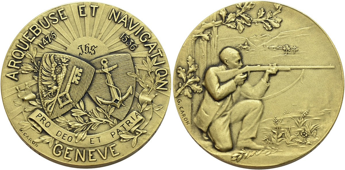 Av.: ARQUEBUSE ET NAVIGATION / 1475 - 1536 // GENEVE, zwei Wappen vor aufgehender Sonne mit IHS, darunter Lorbeerzweig und Spruchband, signiert links G. CARON.