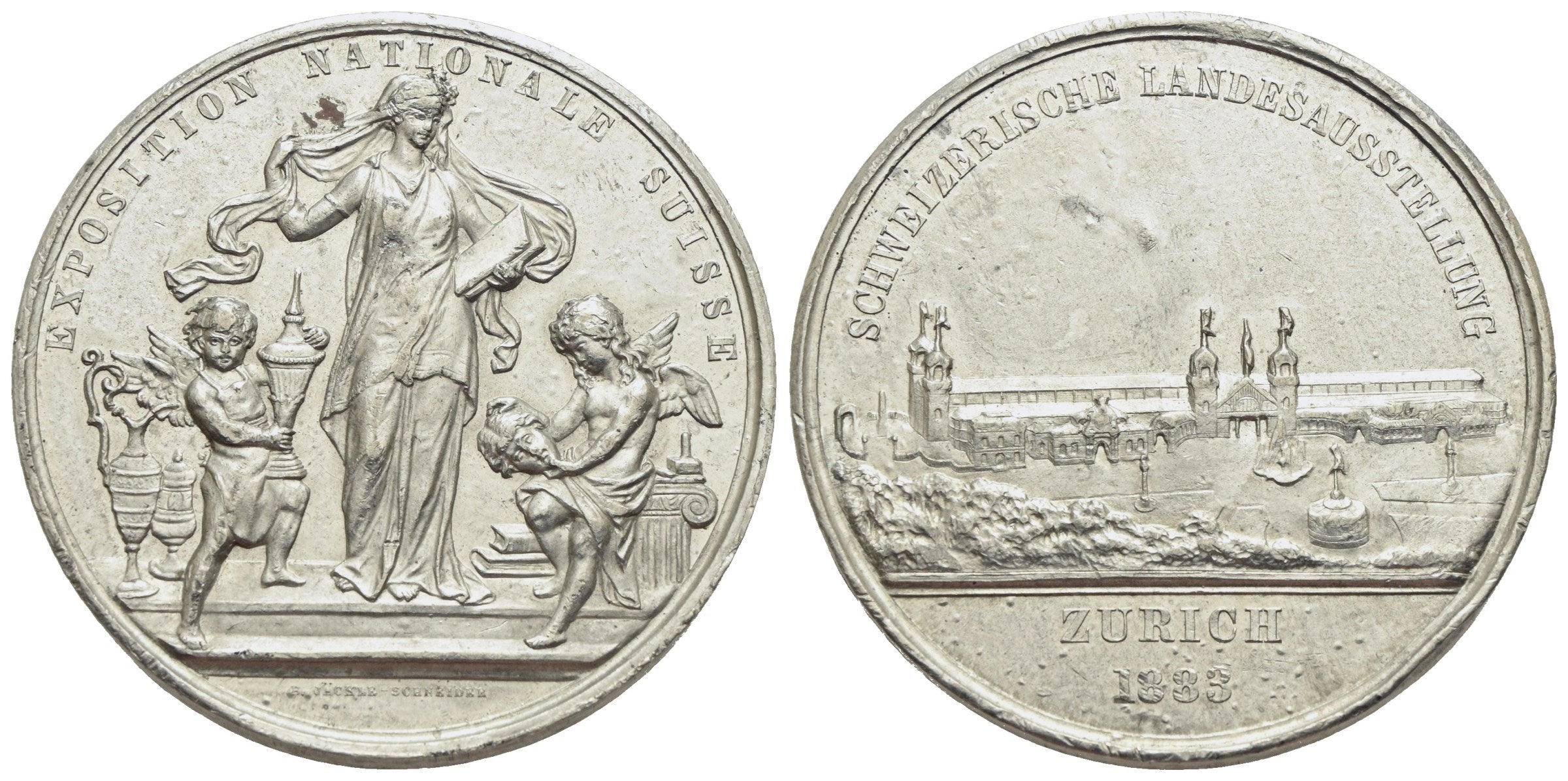 Av.: EXPOSITION NATIONALE SUISSE, weibliche Personifikation steht zwischen zwei Putti, umringt von Kunstgegenständen, signiert im Abschnitt B. JÄCKLE-SCHNEIDER.