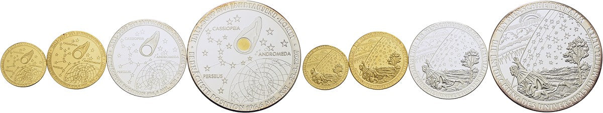 Bestehend aus 2 AV-Medaillen (8g und 3,5g) und 2 AR-Medaillen (50g und 20g) in 999,9 Feinheit.