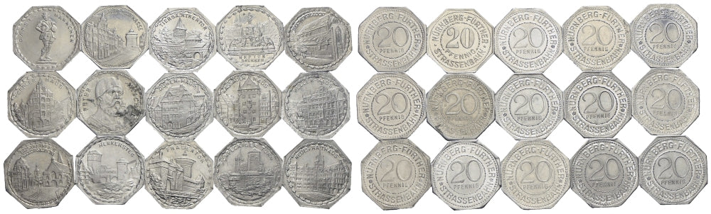 20 Pfennig o.J. (1921) - Serie von 15 Nürnberg-Fürther Strassenbahn-Münzen mit Teilansichten von Fürth und Nürnberg, aus Aluminium.