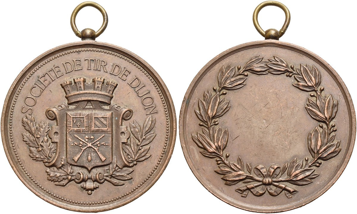 Av.: SOCIETE DE TIR DE DIJON, zwischen Eichen- und Lorbeerzweigen das bekrönte Wappen von Dijon mit aufgelegten gekreuzten Gewehren.