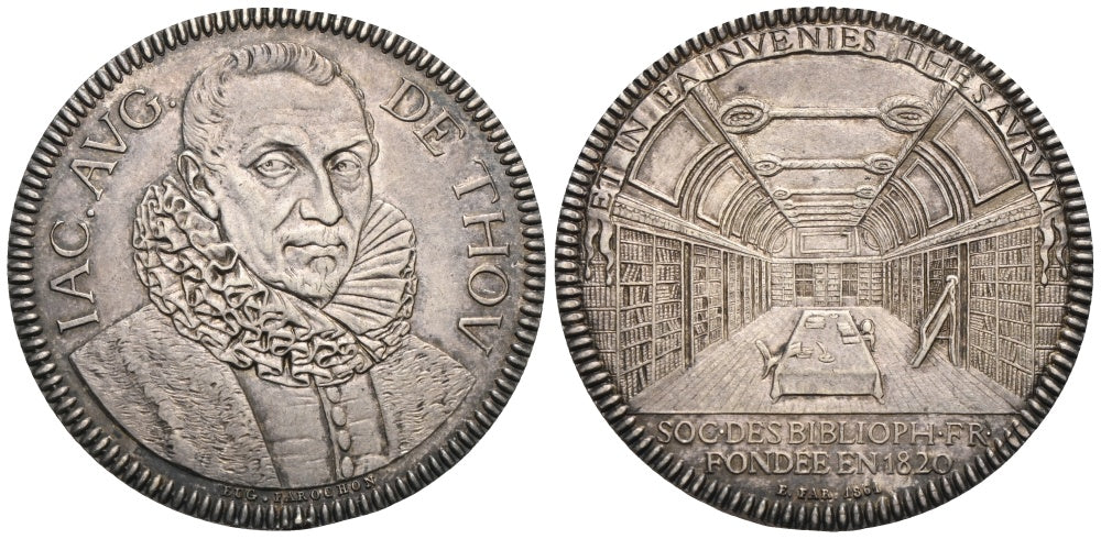 Rv.: Blick auf einen Bibliothekssaal, im Abschnitt: SOC. DES BIBLIOPH. FR. / FONDÉE EN 1820, signiert E. FAR. 1861.