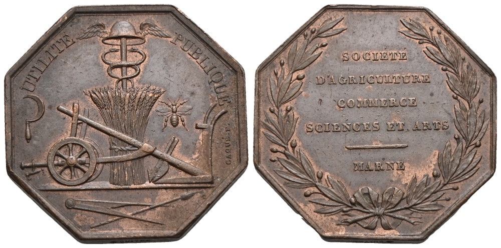 Av.: UTILITÉ - PUBLIQUE, Hermesstab über Korngarbe und Pflug zwischen Sichel und Biene, im Abschnitt Zirkel und Pinsel, signiert rechts CAQUÉ F.
