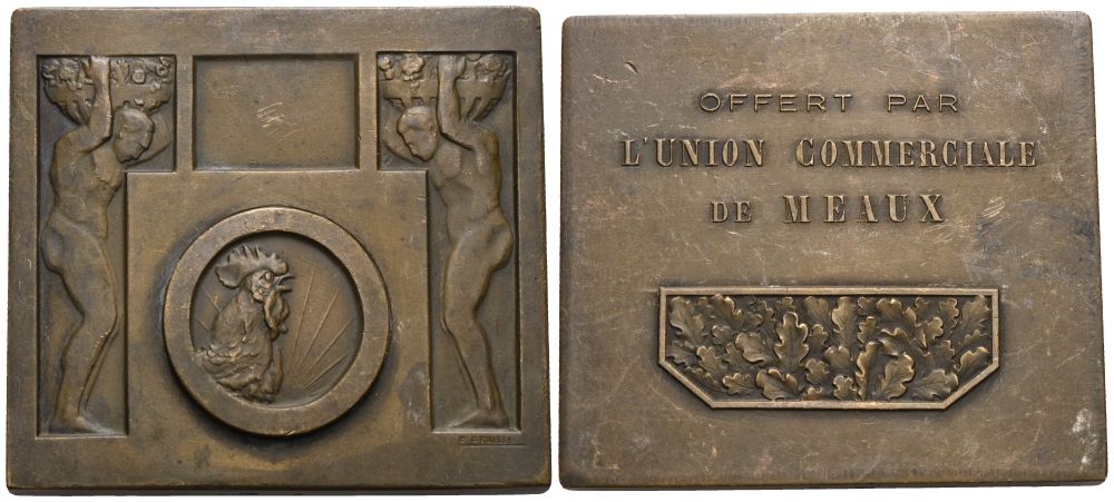 Av.: In der Mitte runde Kartusche mit Hahnprotome, flankiert von zwei Atlanten mit Frucht- und Blumenschalen, signiert E. FRAISSE.