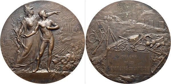 Rv.: In einer gebirgigen Landschaft, in der die Sonne aufgeht, drei Gewehrpyramiden, an der mittleren lehnt ein Fahrrad, im Hintergrund Schießscheiben, über einer Tafel mit 3 Zeilen Schrift ein Haufen von Sportgeräten, darin eine Trompete und Trommel, ein Anker und ein Kürass, unter der Tafel ein Vogel, der seinen Kopf in sein Gefieder steckt, OFFERT / PAR LES / SENATEURS DE LA MEUSE.