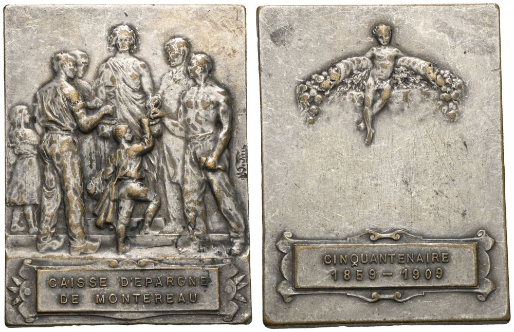 Av.: Personifikation der Weitsicht frontal stehend mit Geldbeutel in den Händen, die von verschiedenen herumstehenden Menschen gefüllt werden, in Kartusche darunter CAISSE D'EPARGNE / DE MONTEREAU, signiert Lamourdedieu.