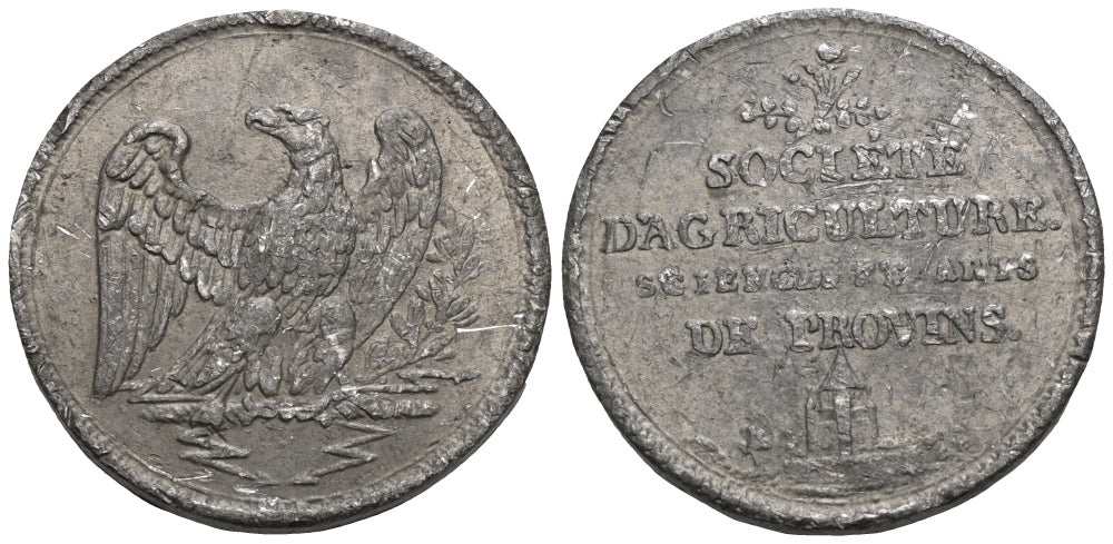 Rv.: SOCIÉTÉ / D'AGRICULTURE. / SCIENCES ET ARTS / DE PROVINS., 4 Zeilen Schrift, darüber Rose, darunter der Turm César.