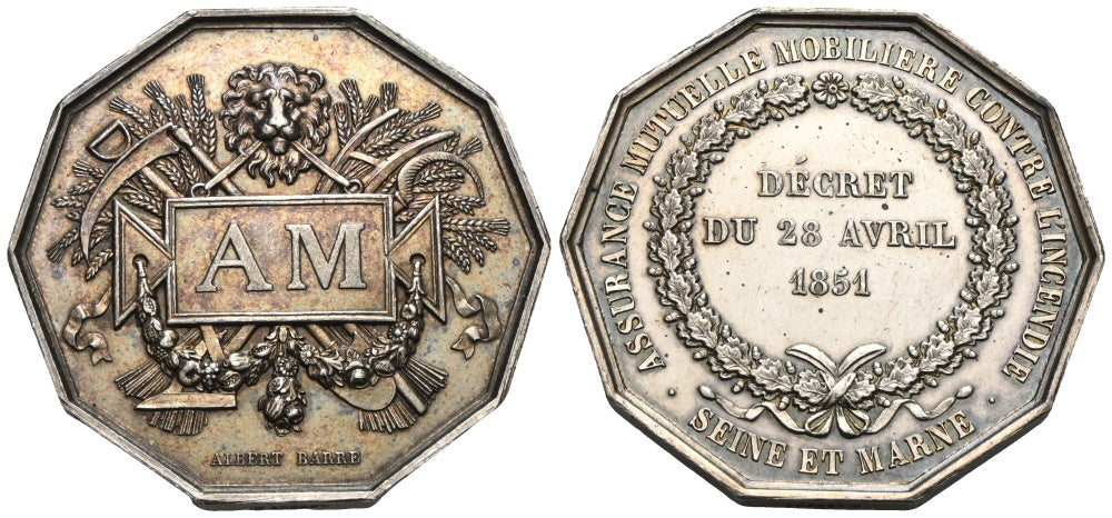 Rv.: ASSURANCE MUTUELLE MOBILIERE CONTRE LINCENDIE / SEINE ET MARNE, 3 Zeilen Schrift in Eichenkranz: DÉCRET / DU 28 AVRIL /1851.