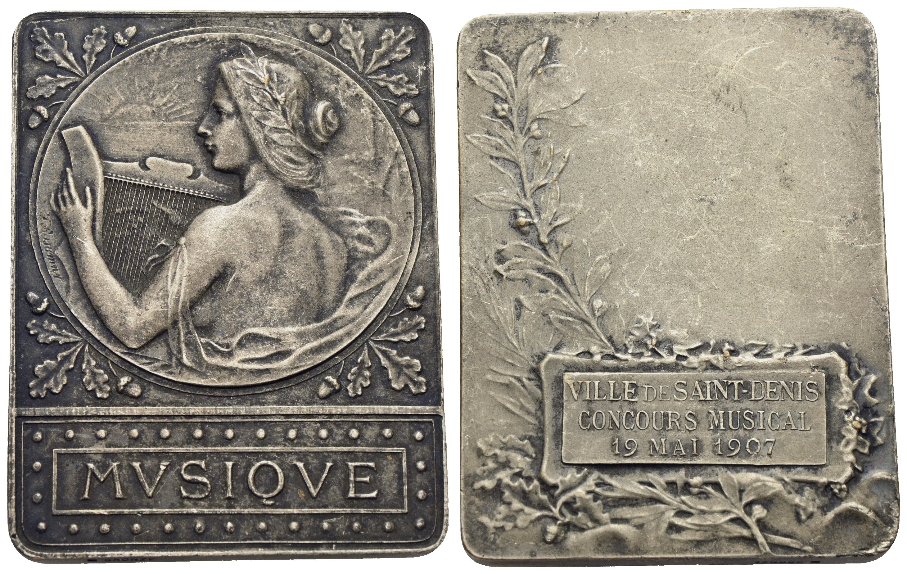 Rv.: Tafel mit 3 Zeilen Schrift vor Eichen- und Lorbeerzweigen: VILLE DE SAINT-DENIS / CONCOURS MUSICAL / 19 MAI 1907.