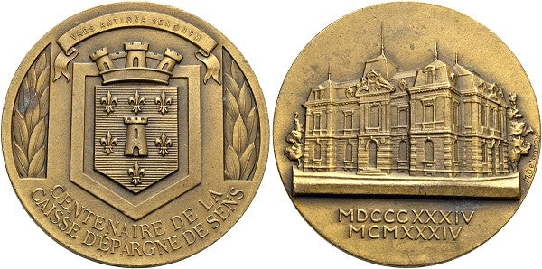 Av.: CENTENAIRE DE LA / CAISSE D'EPARGNE DE SENS, Stadtwappen zwischen Lorbeerlaub.