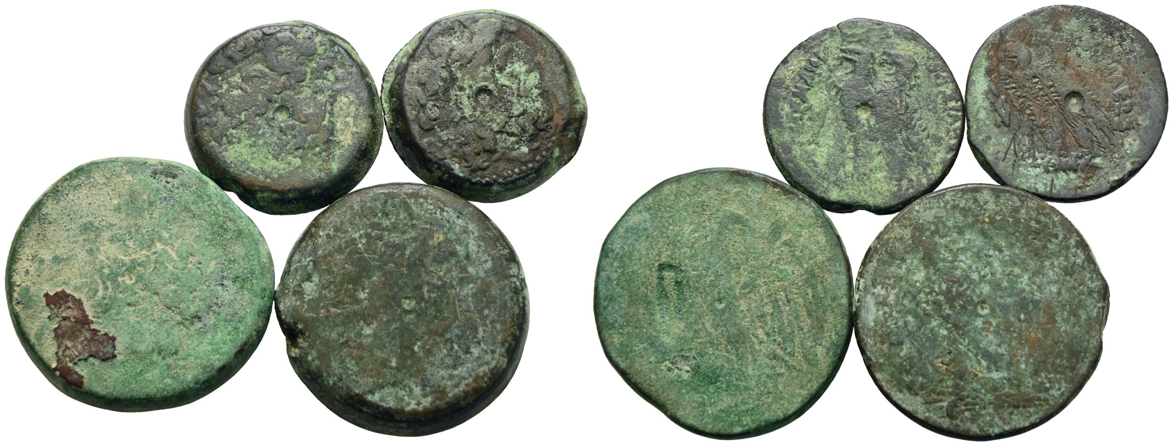 Zwei AE-Tetrobolen von Ptolemaios III. Euergetes (246-221), Kopf des Zeus Ammon / Adler auf Blitzbündel.