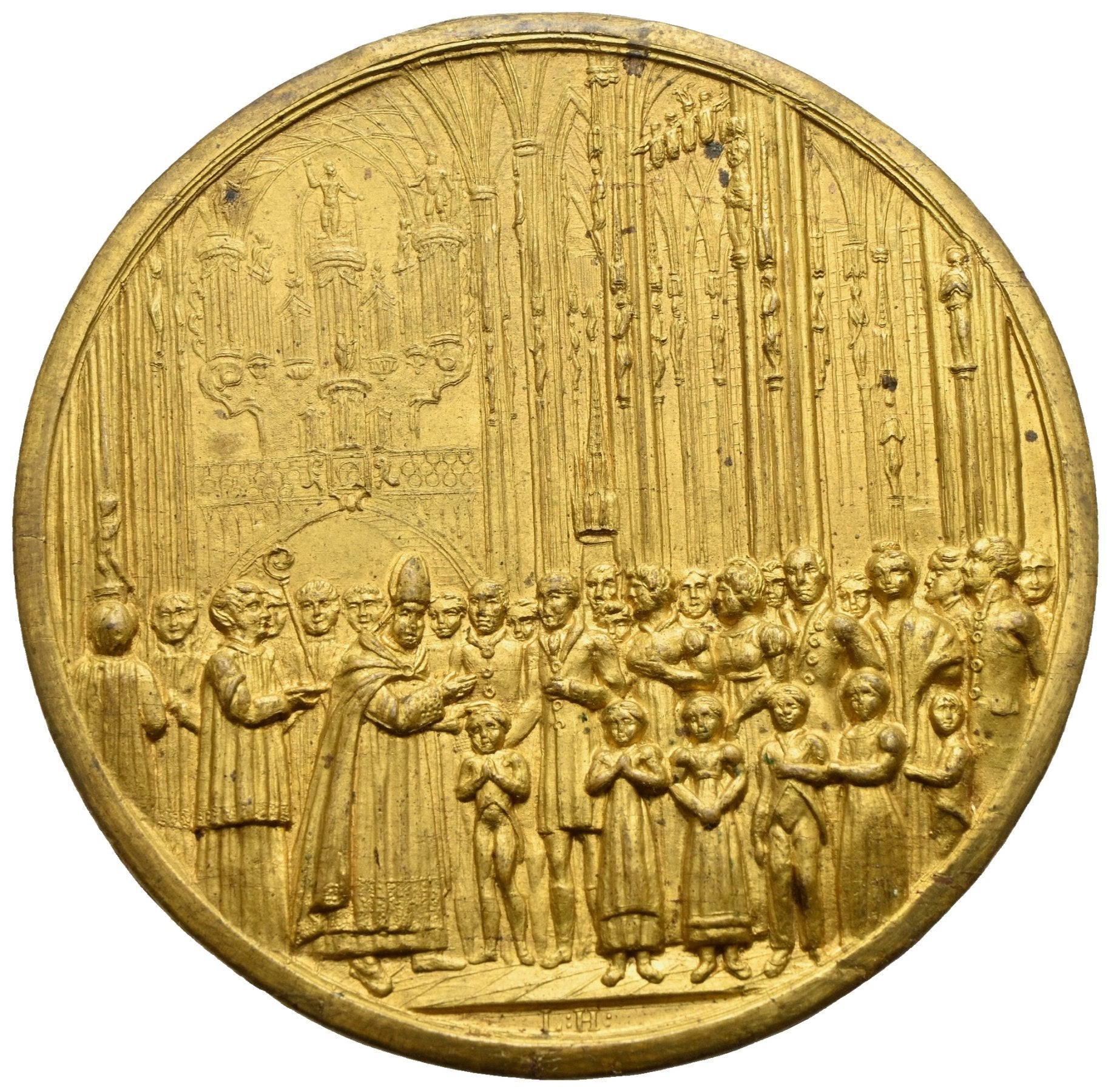 Darstellung der Firmung in einer großen Kirche, bei der die Firmpaten mit ihren Firmlingen zur Weihe aufgestellt sind, signiert unten L:H:.