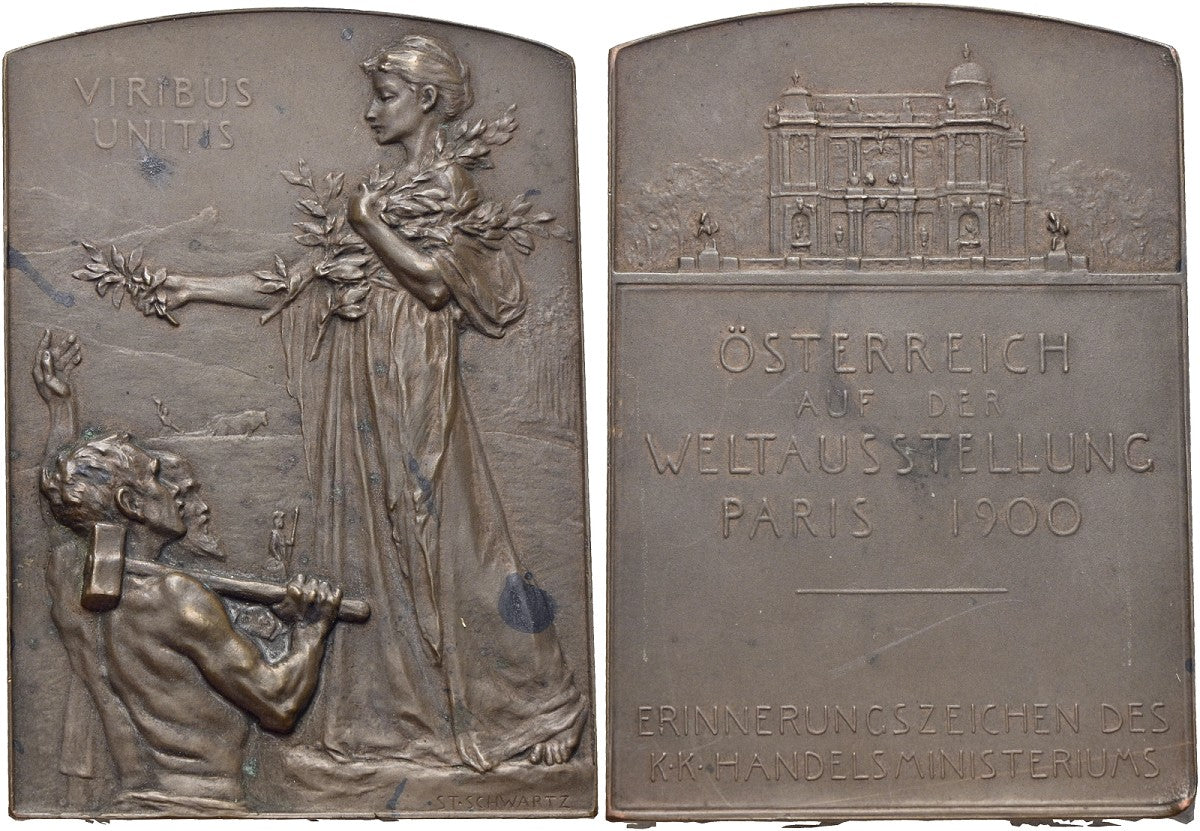 Rv.: Ansicht des Österreichischen Pavillons über einer Schrifttafel mit 6 Zeilen Schrift: ÖSTERREICH / AUF DER / WELTAUSSTELLUNG / PARIS 1900 / ERINNERUNGSZEICHEN DES / K.K. HANDELSMINISTERIUMS, signiert ST SCHWARTZ.