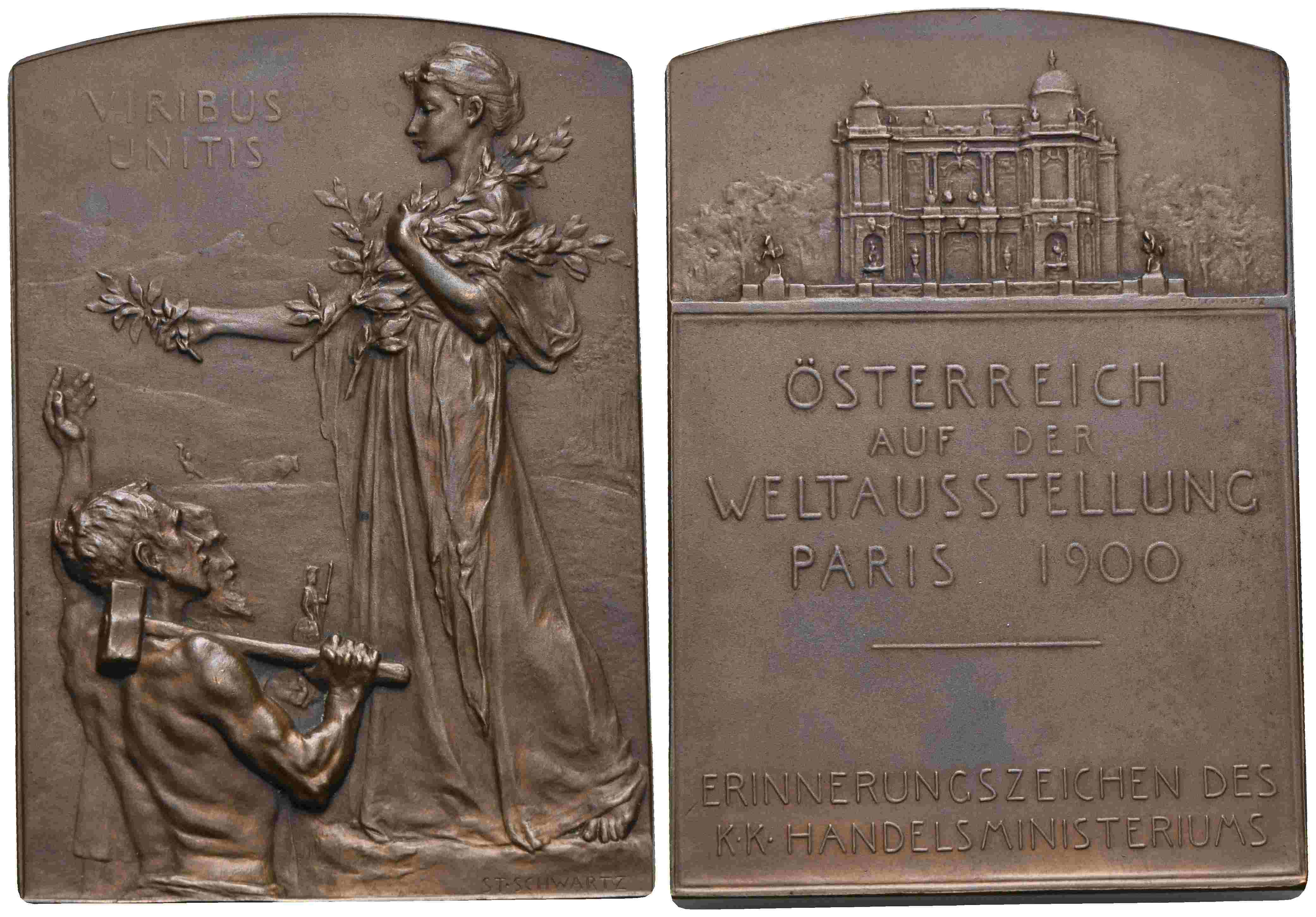 Rv.: Ansicht des Ausstellungspavillons, darunter 6 Zeilen Schrift ÖSTERREICH / AUF DER / WELTAUSSTELLUNG / PARIS 1900 / ERINNERUNGSZEICHEN DES / K.K. HANDELSMINISTERIUMS, signiert ST. SCHWARTZ.