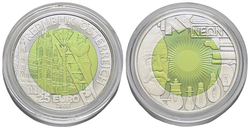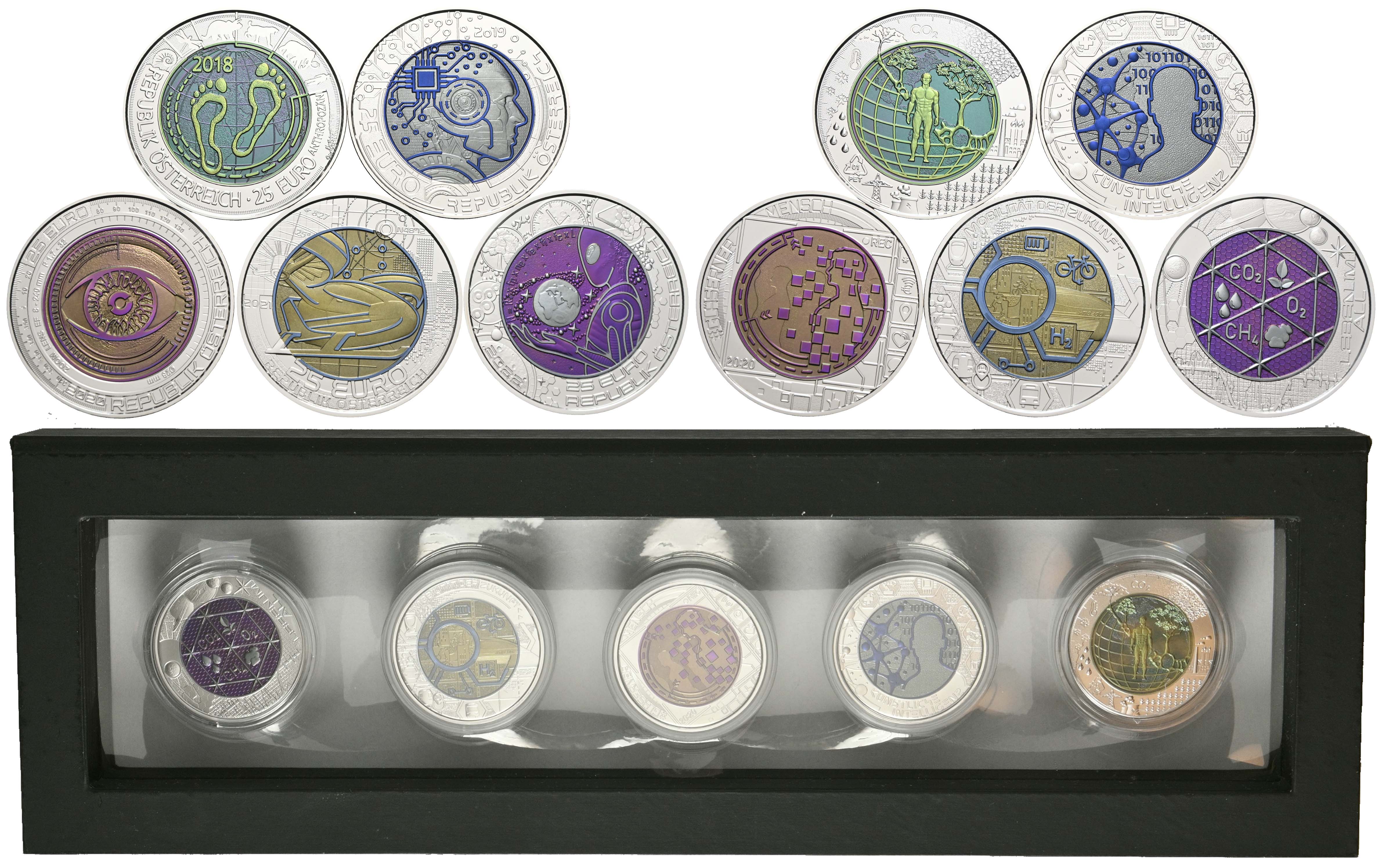 6-teiliges Set aus 25 Euro Niob 2008 Neon, 2018 Anthropozän, 2019 Künstliche Intelligenz, 2020 Gläserner Mensch, 2021 Mobilität der Zukunft und 2022 Leben im All.