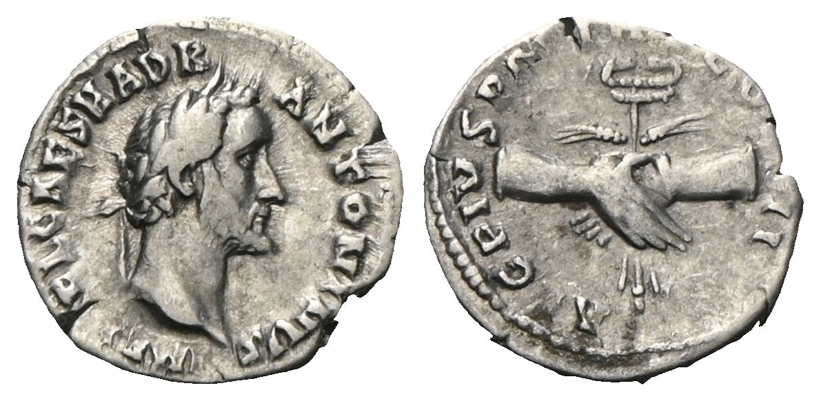 Rv.: AVG PIVS P M TR P COS II [P P], Dextrarum iunctio, dahinter Kornähren und Caduceus.