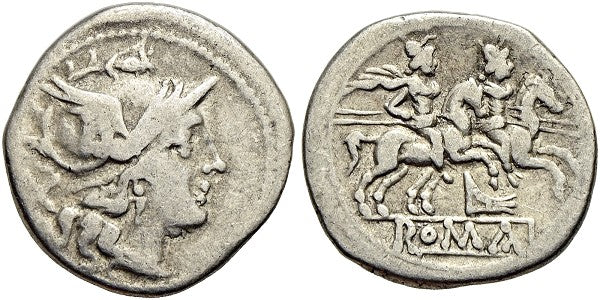 Rv.: ROMA, Dioskuren reiten nach rechts, unten Rostrum.