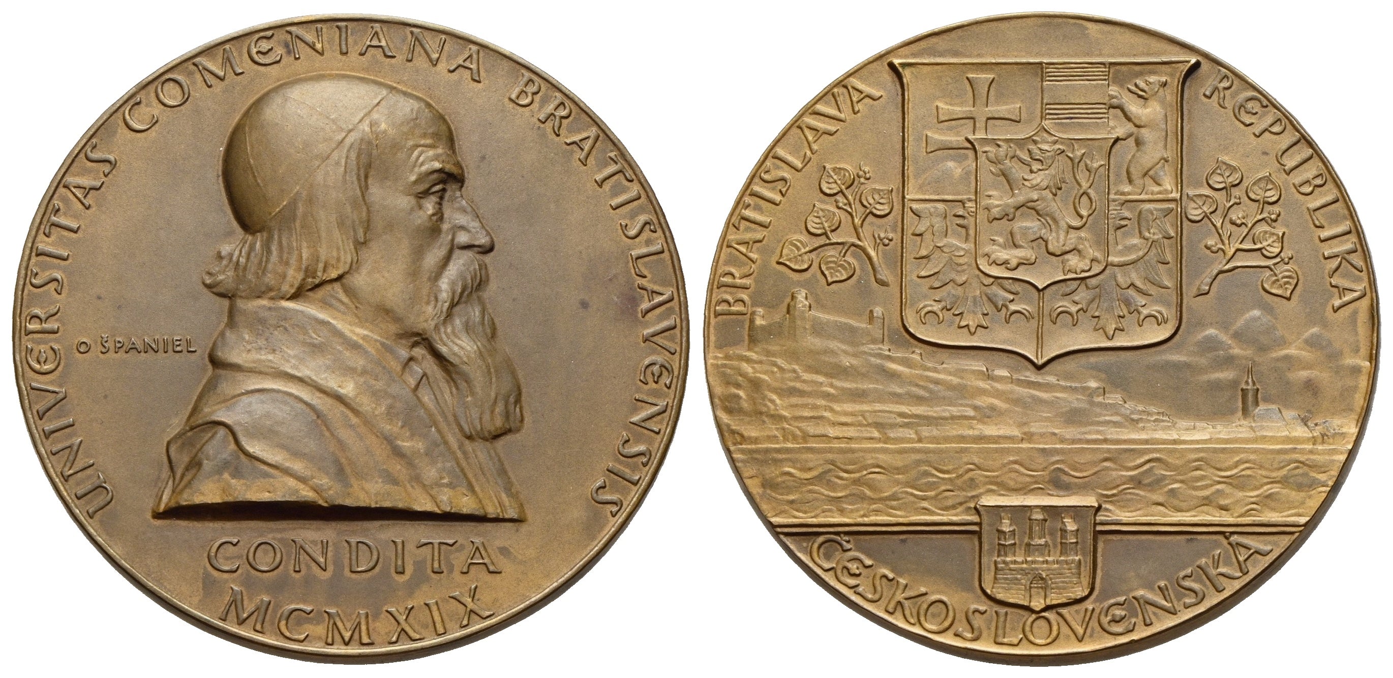 Av.: UNIVERSITAS COMENIANA BRATISLAVENSIS, Brustbild von Jan Amos Komensky (Comenius) in Talar mit Kappe nach rechts, im Abschnitt CONDITA / MCMXIX, signiert im Feld O SPANIEL.