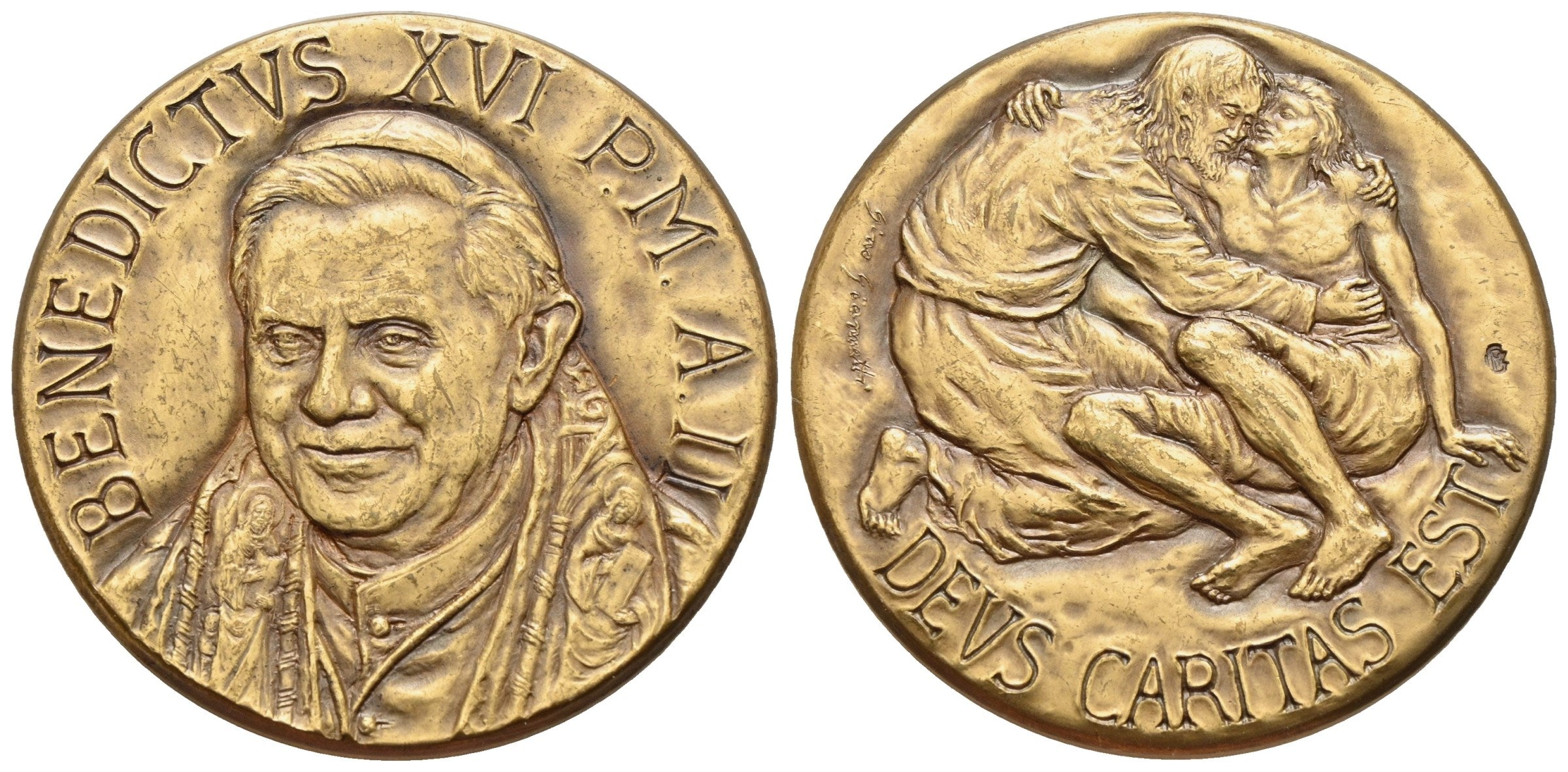 Rv.: DEVS CARITAS EST, Darstellung des guten Samariters, signiert Gino Giannetti, Punze.